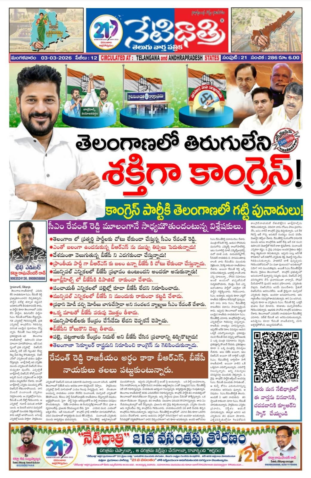 తెలంగాణ రాజకీయాల్లో ఎదురులేని నాయకుడుగా సిఎం. రేవంత్ రెడ్డి ప్రఖ్యాతిగాంచారని చెప్పకతప్పదు. పార్టీని పదేళ్ల తర్వాత కష్టపడి అదికారంలోకి తీసుకురావడమే కాదు, ఆ పార్టీని కూడా తెలంగాణలో ఎదరులేని పార్టీగా, తిరుగులేని పార్టీగా సిఎం. రేవంత్ బలోపేతం చేస్తున్నారు. గత ఎన్నికల్లో గెలిచినప్పటికీ, ప్రతి ఎన్నికల్లో కాంగ్రెస్ను గెలిపిస్తూ మరింత బలమైన పునాదులు వేస్తున్నారు. రేవంత్! నిజం చెప్పాలంటే ప్రతిపక్షాలకు ఇవి తెలంగాణ రాజకీయాల్లో ఊహించని పరిణామాలుగా మారిపోయాయి. ఇదే సందర్భంలో ప్రతి ఎన్నికల్లో బిఆరఎస్ ఆశలన్నీ పదే పదే గý్లంతు! చేస్తూ దెబ్బ మీద దెబ్బ కొడుతున్నారు. బిఆరఎస్లో ఎన్నికలంటే భయం పుట్టేలా చేస్తున్నారు. జూబ్లీ హిల్స్ ఉప ఎన్నికకు ముందు ఎన్నికలంటే బిఆరఎస్ కాలు దువ్వుతూ వుండేది. ఎప్ప్పుడైతే జూబ్లీహిల్స్ బిఆరఎస్ కోల్పోయిందో అప్పటి నుంచి ఎన్నికలంటే ఆ పార్టీకి భయం పట్టుకునేలా చేశారు. దాంతో జూబ్లీహిల్స్ ఎన్నికల ముందున్న జోష్ బిఆరఎస్ లేకుండాపోయింది. దాని వెంటనే పంచాయితీ ఎన్నికలు నిర్వహించారు. ఆ ఎన్నికల్లోనూ సిఎం. రేవంత్ ఒంటి చేత్తో గెలిపించారు. ఆ ఎన్నికల్లో గులాబీ మరింత వాడిపోయింది. ఆ వెంటనే జరిగిన మున్సిపల్ ఎన్నికలతో ముందుకు వెళ్తుందనుకున్న కారు అక్కడే ఆగిపోయింది. అసెంబ్లీ ఎన్నికల్లో ఓటమి పాలైనా పార్లమెంటు ఎన్నికలతో బిఆరఎస్ మరింత పతనానికి ముహూర్తం బలంగా పడిండి. ఇకపోతే తెలంగాణలో బిజేపికి జనం ఆదరణ బాగా కరువైందనే చెప్పాల. పార్లమెంటు ఎన్నికల్లో మోడీ మానియాతో ఎంపిల గెలుపు సాద్యమైంది. కాని సొంతంగా బలమున్న నాయకులు ఎవరూ లేరనేది పంచాయితీ, మున్సిపల్ ఎన్నికలతో తేలిపోయింది. కేవలం పార్టీ పేరుతోమాత్రమే రాజకీయాలు చేస్తున్నారనే విషయం అర్దమైపోయింది. పైగా పార్టీ పెద్దల ఆశీస్సులతోనే ఆ పార్టీ నాయకులు పదవులు పొందుతున్నారు. బిజేపి నాయకులు ఈ రెండున్నరేళ్ల కాలంలో చేసిన ప్రజా ఉద్యమాలులేవు..ప్రజలకు చేరువయ్యింది లేదు. పైగా ఎనమిది మంది ఎంపిలలో ఐక్యత లేదు. ఇదే సమయంలో కాంగ్రెస్ గ్రాఫ్ రాకెట్లా దూసుకుపోతోంది. వరుస విజయాలతో కార్యకర్తలకు మంచి కిక్ వస్తోంది. పంచాయితీ ఎన్నికలకు ముందు కార్యకర్తలు భయపడ్డారు. సిఎం. రేవంత్రెడ్డి ఆత్మవిశ్వాసంతో ముందుకొచ్చారు. ఇప్ప్పుడు ఎన్నికలంటే సై అంటే సై అంటున్నారు. ఒక పార్టీ బలపడాలన్నా, నీరు గారిపోవాలన్నా ఆ పార్టీకి చెందిన నాయకుల ఆత్మవిశ్వాసం ఎంతో ముఖ్యమని సిఎం. రేవంత్రెడ్డి పదే పదే నిరూపిస్తున్నారు. నాయకులకు ఆదర్శంగా నిలుస్తున్నారు. కార్యకర్తలకు ధైర్యం నింపుతున్నారు. తెలంగాణ రాజకీయాల్లో తనకు ఎదురులేదని నిరూపిస్తున్నారు. కాంగ్రెస్ పార్టీకి తన నాయకత్వంలో తెలంగాణలో తిరుగులేకుండా చ
