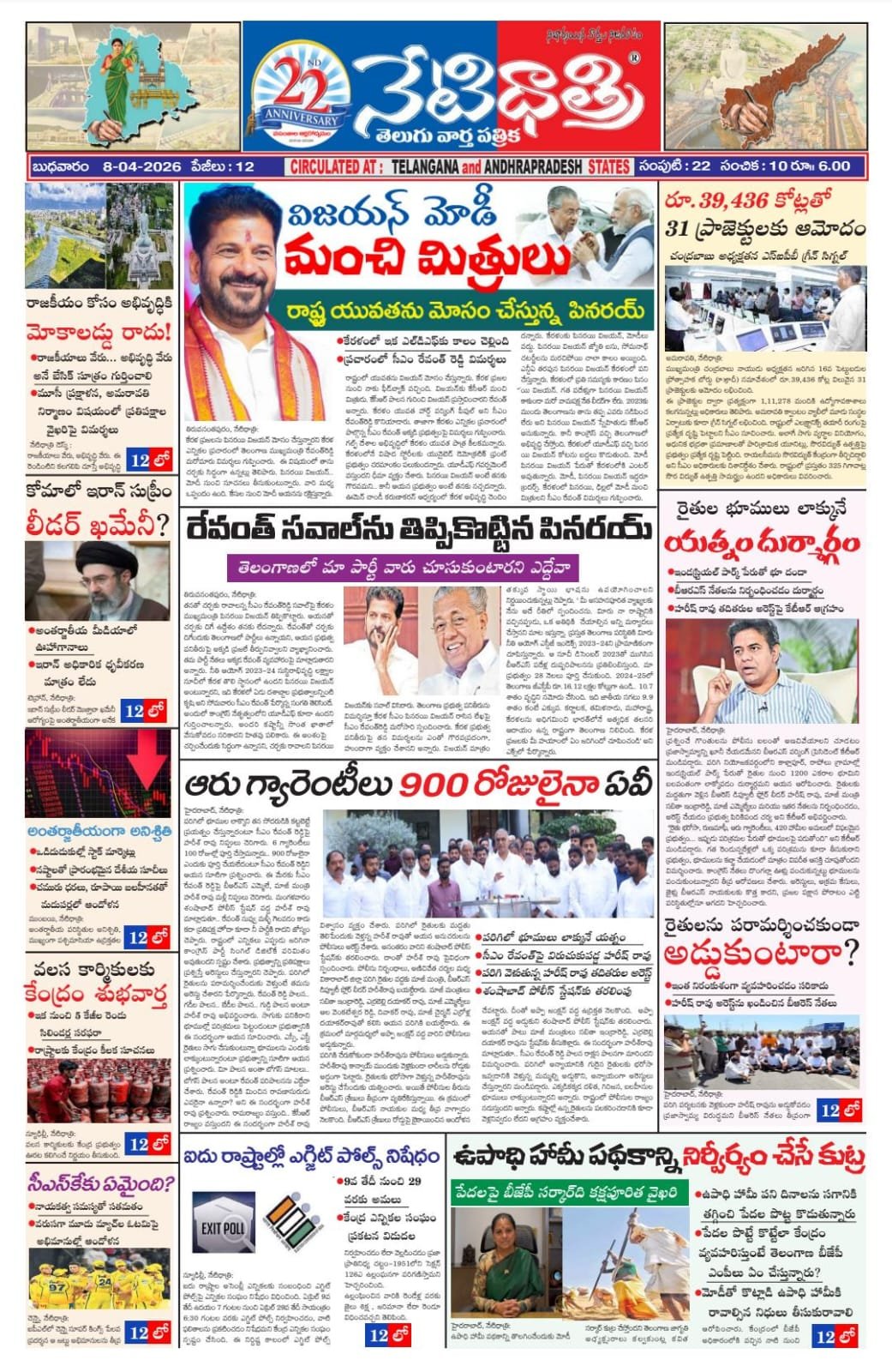 కేరళలో జరుగనున్న ఎన్నికల్లో కాంగ్రెస్ హవా స్పష్టంగా కనిపిస్తోంది. బలంగా కాంగ్రెస్ గాలి వీస్తోంది. కాంగ్రెస్ పార్టీ మంచి మెజార్టీతో గెలిచి తీరుతుందన్న సంకేతాలు వెలువడుతున్నాయి. కేరళ సిఎం. కావాలన్న కాంగ్రెస్ పార్టీ జాతీయ ప్రధాన కార్యదర్శి కేసి. వేణుగోపాల్ కల నెరవేరనుందని జనం అనుకుంటున్నారు. తెలంగాణ సిఎం. రేవంత్రెడ్డికి అత్యంత సన్నిహితుడుగా కేసి. వేణుగోపాల్ను చెప్ప్పుకుంటారు. అలా స్నేహితుడు కేరళ సిఎం. కావాలన్న ఆలోచనతో తెలంగాణ సిఎం. రేవంత్ రెడ్డి స్టార్ కాంపెయినర్గా కేరళలో విసత ప్రచారం సాగిస్తున్నారు. ఇప్పటికే ఒక దఫా ఎన్నికల ప్రచారం రెండు రోజులు పాటు నిర్వహించారు. అక్కడ అనేక సభలు, సమావేశాలు కూడా నిర్వహించారు. తెలంగాణసిఎం. రేవంత్రెడ్డి చేసిన రోడ్షోలకు జనం విపరీతంగా వచ్చారు. రేవంత్ రెడ్డి సభలు, సమావేశాలకు జనం తండోపతండాలుగా తరలి వచ్చారు. తెలంగాణలో అమలు జరుగుతున్న అభివద్ది సంక్షేమ పథకాలపై రేవంత్ రెడ్డి చెబుతున్నప్ప్పుడు ఆసక్తిగా విన్నారు. స్నేహం కోసం సిఎం. రేవంత్రెడ్డి ఎంత దూరమైనా వెళ్తారు. ఈ సంగతి తెలియంది కాదు. అలాంటిది పార్టీ గెలుపుకోసం ఆయన పడే శ్రమ కూడా తెలంగాణ ప్రజలకు తెలుసు. అందుకే తెలంగాణలో పదేళ్ల తర్వాత కాంగ్రెస్ను ప్రజలు గెలిపించారు. తెలంగాణ ఇచ్చిన కాంగ్రెస్ను ప్రజలు ఆదరించారు. కేవలం సిఎం. రేవంత్రెడ్డి చెప్పిన మాటలు తెలంగాణ ప్రజలు బలంగా విశ్వసించారు. అలా ప్రజల నమ్మకాన్ని చూరగొనడం రేవంత్రెడ్డికి కొత్త కాదు. ఆయన రాజకీయ ప్రస్తానమే ఒక నమ్మకంతో మొదలైంది. ఆయన ఆత్మ స్ధైర్యం అంత గొప్పది. ఆయన విజన్ అంత దఢంగా వుంటుంది. నిజానికి రేవంత్ రెడ్డి ఏది తల్చుకుంటే దానిని సాదించే వరకు విశ్రమించరు. ఒక్కసారి ఆయన నిర్ణయం తీసుకున్న తర్వాత ఎన్ని అవాంతరాలెదురైనా వెనుదిరిగి చూడరు. ఎంతటి కష్టానికైనా వెనుకాడరు. ఎలాంటి అవరోదాలనైనా ఎదుర్కొంటారు. అటు మానసికంగా, ఇటు శారీరకంగా అంత్యంత దఢమైన లక్ష్యం వున్నవారికే సాద్యమౌతుందని మరోసారి నిరూపించిన నాయకుడు సిఎం. రేవంత్రెడ్డి. తెలంగాణలో కూడా కాంగ్రెస్ ఇక అధికారంలోకి రాదు. అనే స్ధితి నుంచి నేను తెలంగాణలో కాంగ్రెస్ను అధికారంలోకి తీసుకొస్తాను. అనే విశ్వాసాన్ని పార్టీకి కల్గించారు. పార్టీ శ్రేణులకు కల్పించారు. పార్టీని బలోపేతం చేశారు. ఊరూరు తిరిగారు. కాంగ్రెస్ కార్యకర్తల్లో నమ్మకం పురిగొల్పారు. ఈసారి ఎలాగైనా పార్టీని అదికారంలోకి తెచ్చేలా కాంగ్రెస్ నాయకుల్లో ఐక్యత నెలకొల్పారు. పార్టీ కోసం పని చేసే వారికి పెద్ద పీట వేశారు. అలా పార్టీకి ఒక్కొ ఇటుక పేర్చినట్లుపేర్చి, పార్టీని అదికారంలోకి తీసుకొచ్చారు. తాను రాజకీయాల్లోకి వచ్చిందే ఏనాడైనా సిఎం. కావడమే లక్ష్యమన్న మాటను న