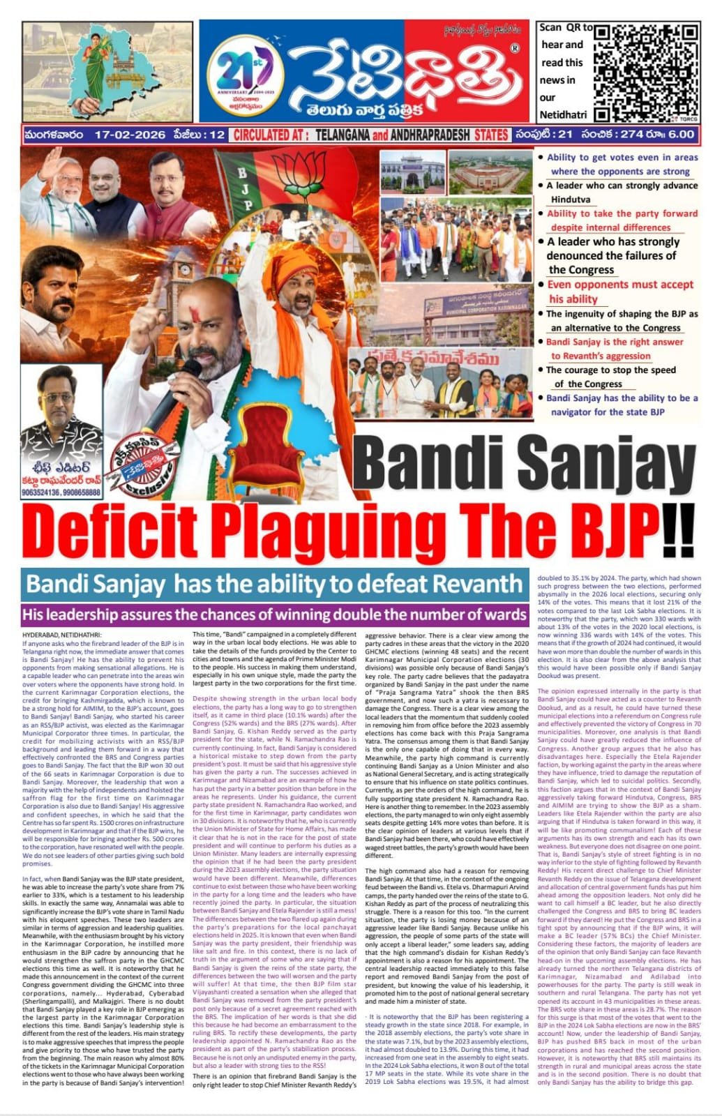 The opinion expressed internally in the party is that Bandi Sanjay could have acted as a counter to Revanth Dookud, and as a result, he could have turned these municipal elections into a referendum on Congress rule and effectively prevented the victory of Congress in 70 municipalities. Moreover, one analysis is that Bandi Sanjay could have greatly reduced the influence of Congress. Another group argues that he also has disadvantages here. Especially the Etela Rajender faction, by working against the party in the areas where they have influence, tried to damage the reputation of Bandi Sanjay, which led to suicidal politics. Secondly, this faction argues that in the context of Bandi Sanjay aggressively taking forward Hindutva, Congress, BRS and AIMIM are trying to show the BJP as a sham. Leaders like Etela Rajender within the party are also arguing that if Hindutva is taken forward in this way, it will be like promoting communalism! Each of these arguments has its own strength and each has its own weakness. But everyone does not disagree on one point. That is, Bandi Sanjay’s style of street fighting is in no way inferior to the style of fighting followed by Revanth Reddy! His recent direct challenge to Chief Minister Revanth Reddy on the issue of Telangana development and allocation of central government funds has put him ahead among the opposition leaders. Not only did he want to call himself a BC leader, but he also directly challenged the Congress and BRS to bring BC leaders forward if they dared! He put the Congress and BRS in a tight spot by announcing that if the BJP wins, it will make a BC leader (57% BCs) the Chief Minister. Considering these factors, the majority of leaders are of the opinion that only Bandi Sanjay can face Revanth head-on in the upcoming assembly elections. He has already turned the northern Telangana districts of Karimnagar, Nizamabad and Adilabad into powerhouses for the party. The party is still weak in southern and rural Telangana. The party has not yet opened its account in 43 municipalities in these areas. The BRS vote share in these areas is 28.7%. The reason for this surge is that most of the votes that went to the BJP in the 2024 Lok Sabha elections are now in the BRS’ account! Now, under the leadership of Bandi Sanjay, BJP has pushed BRS back in most of the urban corporations and has reached the second position. However, it is noteworthy that BRS still maintains its strength in rural and municipal areas across the state and is in the second position. There is no doubt that only Bandi Sanjay has the ability to bridge this gap.