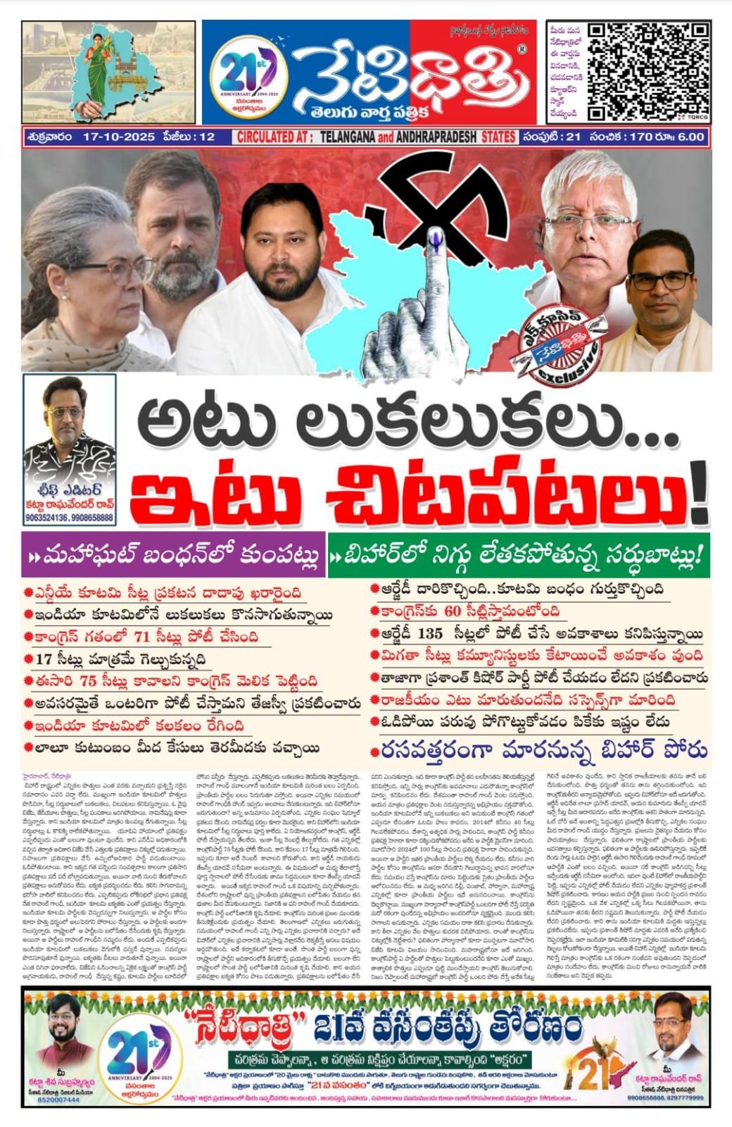 బిహార్ రాష్ట్రంలో ఎన్నికల పొత్తులు ఎంత వరకు వచ్చాయని ప్రశ్నిస్తే సరైన సమాదానం ఎవరి వద్దా లేదు. ముఖ్యంగా ఇండియా కూటమిలో పొత్తులు పొడిచినా, సీట్ల సర్ధుబాటులో లుకలుకలు, చిటపటలు కనిపిస్తున్నాయి. ఓ వైపు బిజేపి, జేడీయూల పొత్తులు, సీట్ల పంపకాలు జరిగిపోయాయి. నామినేషన్లు కూడా వేస్తున్నారు. కాని ఇండియా కూటమిలో మాత్రం కుంపట్లు రేగుతున్నాయి. సీట్ల సర్ధుబాట్లు ఓ కొలిక్కి రాలేకపోతున్నాయి. యూపిఏ హాయాంలో ప్రతిపక్షం ఎప్పటిప్పుడు ఎంతో బలంగా వుంటూ వుండేది. కాని ఎన్డీఏ అధికారంలోకి వచ్చిన తర్వాత అధికార బిజేపి వేసే ఎత్తులకు ప్రతిపక్షాలు చిక్కుల్లో పడుతున్నాయి. సహజంగా ప్రతిపక్షాలు వేసే ఉచ్చులోఅదికార పార్టీ పడుతుంటాయి. ఓడిపోతుంటాయి. కాని ఇక్కడ గత పన్నెండు సంవత్సరాల కాలంగా ప్రతిసారి ప్రతిపక్షాలు పదే పదే బోల్తాపడుతున్నాయి. అయినా వాటి నుంచి తేరుకోవాలని ప్రతిపక్షాలు అనుకోవడం లేదు. ఐక్యత ప్రదర్శించడం లేదు. కలిసి సాగుదామన్న భరోసా వాటిలో కనిపించడం లేదు. ఎప్పటికప్పుడు లోక్సభలో ప్రధాన ప్రతిపక్ష నేత రాహుల్ గాంధీ, ఇండియా కూటమి ఐక్యతకు ఎంతో ప్రయత్నం చేస్తున్నారు. ఇండియూ కూటమి పార్టీలకు వెన్నుదన్నుగా నిలుస్తున్నారు. ఆ పార్టీల కోసం కూడా పొత్తు ధర్మంలో అలుపెరగని పోరాటం చేస్తున్నారు. ఆ పార్టీలకు అండగా నిలుస్తున్నారు. రాష్ట్రాలలో ఆ పార్టీలను బలోపేతం చేసేందుకు కృషి చేస్తున్నారు. అయినా ఆ పార్టీలు రాహుల్ గాంధీని నమ్మడం లేదు. అందుకే ఎప్పటికప్పుడు ఇండియా కూటమిలో లుకలుకలు వెగులోకి వస్తునే వున్నాయి. సమస్యలు పొడసూపుతూనే వున్నాయి. ఐక్యతకు బీటలు వారుతూనే వున్నాయి. అయినా ఎంత దిగినా ఫరావాలేదు. బిజేపిని ఓడిరచాలన్న ఏకైక లక్ష్యంతో కాంగ్రెస్ పార్టీ అగ్రనాయకుడు, రాహుల్ గాంధీ చేస్తున్న కష్టం, కూటమి పార్టీలు బూడిదలో పోసిన పన్నీరు చేస్తున్నారు. ఎప్పటికప్పుడు లుకలుకలు తెరమీదకు తెస్తూనేవున్నారు. రాహుల్ గాంధీ మూలంగానే ఇండియా కూటమికి మరింత బలం ఏర్పడిరది. ప్రాంతీయ పార్టీల బలం పెరుగుతూ వస్తోంది. అయినా ఎన్నికల సమయంలో రాహుల్ గాంధీకి హాండ్ ఇవ్వడం అలవాటు చేసుకుంటున్నారు. ఇది బిహార్లోనూ జరుగుతుందా? అన్న అనుమానం ఏర్పడుతోంది. ఎన్నికల సంఘం షెడ్యూల్ ప్రకటన చేసింది. నామినేషన్ల పర్వం కూడా మొదలైంది. కాని బిహార్లోని ఇండియా కూటమిలో సీట్ల సర్ధుబాటు పూర్తి కాలేదు. ఏ నియోజకవర్గంలో కాంగ్రెస్, ఆర్జేడీ పోటీ చేస్తాయన్నది తేలలేదు. ఇంకా సీట్ల నెంబర్లే తేల్చుకోలేదు. గత ఎన్నికల్లో కాంగ్రెస్పార్టీ 75 సీట్లకు పోటీ చేసింది. కాని కేవలం 17 సీట్లు మాత్రమే గెలిచింది. ఇప్పుడు కూడా అదే నెంబర్ కావాలని కోరుతోంది. కాని ఆర్జేడీ నాయకుడు తేజస్వీ యాదవ్ ససేమిరా అంటున్నారు. ఈ విషయం