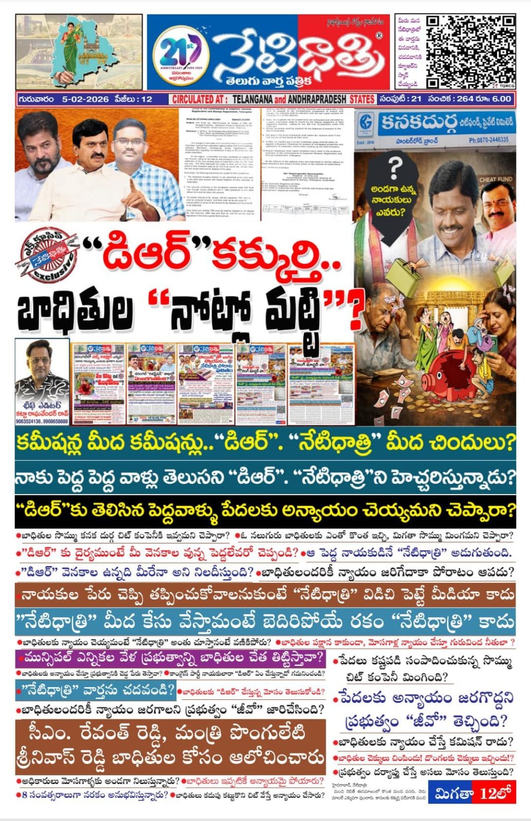 మంచి చెబితే ఈసమాజంలో కొంత మంది వనరు. చెడు మాటలే ఎక్కువగా వుంటారు. కాసులకు కక్కుర్తి పడేవారికి మంచి మాటలు అసలే చెవికెక్కవు. కనÅ£దుర్గ చిట్పండ్ విషయంలో నేటిధాత్రి బాధితులకు న్యాయం చేయాలని కోరుతోంది. వారిని ఆదుకోవాలని సూచిస్తోంది. కాని డీఆర్ ఏం చేస్తున్నారు. బాధితుల పక్షాన కాదని, చిట్ కంపనీకి మేలు చేసే దారిలో వున్నారు. అది తప్పని నేటిధాత్రి చెబుతోంది. ఎందుకంటే 8 సంవత్సరాలుగా బాధితులు వాళ్లు పెట్టిన సొమ్ముకోసం ఎదురుచూస్తున్నారు. ఎంతో నమ్మకంతో కనకదుర్గ చిట్ ఫండ్ కంపనీలో చిట్లు వేసుకున్నారు. కంపనీ ఏజెంట్లు చెప్పిన మాటలు విన్నారు. కంపనీపై న మ్మకం పెంచుకున్నారు. కష్టపడి సంపాదించి, రూపాయి, రూపాయి కూడబెట్టుకొని చిట్టిలు కట్టారు. అవసరానికి అక్కరకొస్తాయని ఆశపడ్డారు. కాని ఏం జరిగింది. కంపనీ దివాళా తీసిందని చేతులెత్తేసి చిట్టిలు కట్టిన వారిని శఠగోపం పెట్టాలని చూశారు. బాదితులు లబోదిబోమన్నారు. కష్టపడి సంపాదించుకున్న సొమ్ము, చిట్స్ పంకనీ దోచేస్తుంటే కడుపు నిండా తిండి తినలేక, కంటి నిండా నిద్ర రాక 8 సంవత్సరాలుగా ఏడుస్తున్నారు. సిఎం. రేవంత్ రెడ్డి సర్కారు పుణ్యమా అని వారి ఆశలు తీరే దారి కనిపించింది. చిట్టిలు కట్టిన వారు ఎవరూ తెలంగాణలో మోసపోవద్దని రాష్ట్ర ప్రభుత్వం జీవో జారీ చేసింది. తెలంగాణలో వున్న అన్ని చిట్ ఫండ్ కంపనీలకు ఈ జీవో వర్తిస్తుందని, ఏ కంపనీ బాధితులను మోసం చేయొద్దని మంత్రి పొంగులేటి శ్రీనివాస్ రెడ్డి బాధితుల పక్షాన నిలిచారు. ప్రజల సొమ్ము ఎగవేయాలని చూసిన కంపనీలకు హెచ్చరికలు జారీ చేశారు. కనకదుర్గ చిట్ కంపనీ నుంచి బాదితులకు సొమ్ములు చెల్లించాలని ఆదేశాలు జారీ చేశారు. కాని ఏమైంది? శతకోటి దరిద్రాలకు అనంతకోటి ఉపాయాలన్నట్లు జిల్లా రిజిస్ట్రార్ బాదితుల పక్షాన కాకుండా చిట్ కంపనీకి మేలు చేసేలా వ్యవహరిస్తున్నట్లు ఆరోపణలు వచ్చాయి. బాదితులు అనేక మంది నేటిధాత్రిని ఆశ్రయించారు. ప్రభుత్వం పేదల పక్షాన నిలిస్తే అదికారులు మోసగాళ్లతో చేతులు కలుపుతున్నారు. ఆశలు నెరవేరే సమయంలో ఆ ఆశలు అడియాసలయ్యేలా వున్నాయి. మా సొమ్ము మొత్తం ఆవిరయ్యే పరిస్దితులు కనిపిస్తున్నాయని నేటిధాత్రికి తమ గోడు వెళ్లబోసుకున్నారు. దానిపై నేటిధాత్రి దినపత్రిక కథనం రాసింది. బాదితుల పక్షాన నిలిచింది. బాధితులు చెప్పిన విషయాలను చెప్పింది. అంతే డిఆర్కు కోపం వచ్చింది. నేటిదాత్రి మీద చిందులేసినట్లు తెలిసింది. నేటిధాత్రి మీద కేసు నమోదు చేస్తానని బెదిరించేలా వ్యాఖ్యలు చేస్తున్నారని సమాచారం అందింది. అసలు నేటిధాత్రి అడిగిందేమిటి? రిజిస్ట్రార్వా..లేక రింగ్ మాస్టర్వా? అని ఫ్రశ్నించింది. బాధితులను మోసం చేస్తుంటే నేటిధాత్రి చూస్తూ ఊరుకోవాలా? లేక చాల మ