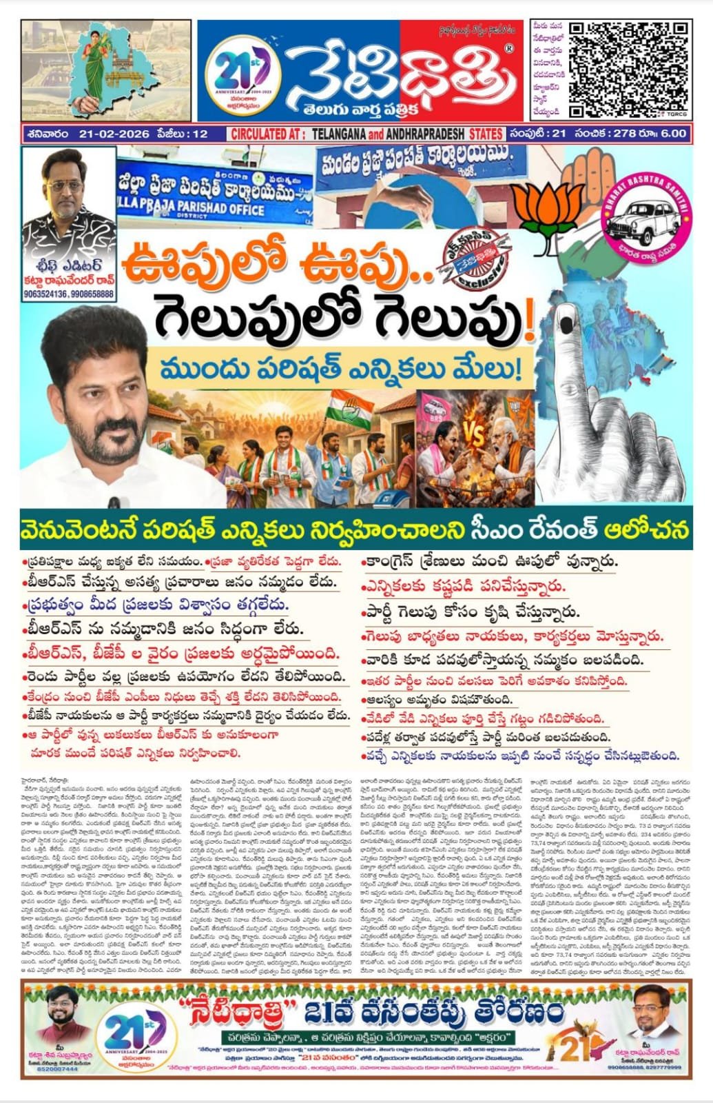 వేడిగా వున్నప్ప్పుడే ఇనుమును వంచాలి. జనం ఆదరణ వున్నప్ప్పుడే ఎన్నికలకు వెళ్లాలన్న సూత్రాన్ని రేవంత్ సర్కార్ పక్కాగా అమలు చేస్తోంది. వరుసగా ఎన్నికల్లో కాంగ్రెస్ పార్టీ గెలుస్తూ వస్తోంది. నిజానికి కాంగ్రెస్ పార్టీ కూడా ఇంతటి విజయాలను ఆరు నెలల క్రితం ఊహించలేదు. కిందిస్దాయి నుంచి పై స్దాయి దాకా ఆ నమ్మకం కలగలేదు. ఎందుకంటే ప్రతిపక్ష బిఆరఎస్ చేసిన అసత్య ప్రచారాలు బలంగా ప్రజల్లోకి వెళ్లాయన్న భావన కాంగ్రెస్ నాయకుల్లో కనిపించింది. దాంతో స్ధానిక సంస్ధల ఎన్నికలు కావాలని కూడా కాంగ్రెస్ శ్రేణులు ప్రభుత్వం మీద ఒత్తిడి తేలేదు. సరైన సమయం చూసడి ప్రభుత్వం నిర్వహిస్తుందని అనుకున్నారు. డిల్లీ నుంచి కూడ పరిశీలకులు వచ్చి, ఎన్నికల నిర్వహణ మీద నాయకులు,కార్యకర్తలతో రాష్ట్ర వ్యాప్తంగా చర్చలు కూడా జరిపారు. ఆ సమయంలో కాంగ్రెస్ నాయకులు ఇది అనువైన వాతావరణం కాదనే తేల్చి చెప్పారు. ఆ సమయంలో హైడ్రా దూకుడు కొనసాగింది. పైగా ఎరువుల కొతర తీవ్రంగా వుంది. ఈ రెండు కారణాలు స్దానిక సంస్ధల ఎన్నికల మీద ప్రభావం పడతాయన్న భావన అందరూ వ్యక్తం చేశారు. అనుకోకుండా కాంగ్రెస్కు జూబ్లీ హిల్స్ ఉప ఎన్నిక వరమైంది. ఆ ఉప ఎన్నికలో కాంగ్రెస్ ఓటమి ఖాయమని కాంగ్రెస్ నాయకులు కూడా అనుకున్నారు. ప్రచారం చేయడానికి కూడా పెద్దగా పెద్ద పెద్ద నాయకులే ఆసక్తి చూపలేదు. ఒక్కసారిగా ఎవరూ ఊహించని అభ్యర్దిని సిఎం. రేవంత్రెడ్ది తెరమీదకు తేవడం, స్వయంగా ఆయన ప్రచారం నిర్వహించడంతో వార్ వన్ సైడ్ అయ్యింది. అలా మారుతుందని ప్రతిపక్ష బిఆరఎస్ కలలో కూడా ఊహించలేదు. సిఎం. రేవంత్ రెడ్డి వేసిన ఎత్తుల ముందు బిఆరఎస్ చిత్తయిపోయింది. జనంలో వ్యతిరేకత వుందన్న బిఆరఎస్ మాటలకు చెల్లు చీటి రాసింది. ఆ ఉప ఎన్నికలో కాంగ్రెస్ పార్టీ అనూహ్యమైన విజయం సాదించింది. ఎవరూ ఊహించనంత మెజార్టీ వచ్చింది. దాంతో సిఎం. రేవంత్రెడ్డికి మరింత విశ్వాసం పెరిగింది. సర్పంచ్ ఎన్నికలకు వెళ్లారు. ఉప ఎన్నిక గెలుపుతో వున్న కాంగ్రెస్ శ్రేణుల్లో ఒక్కసారిగాఊపు వచ్చింది. అంతకు ముందు పంచాయితీ ఎన్నికల్లో పోటీ చేద్దామా లేదా? అన్న డైలమాలో వున్న అనేక మంది నాయకులు తర్వాత ముందుకొచ్చారు. టికెట్ నాకంటే నాకు అని పోటీ పడ్డారు. అంతగా కాంగ్రెస్ పుంజుకున్నది. నిజానికి ప్రజల్లో ప్రజా ప్రభుత్వం మీద ప్రజా వ్యతిరేకత లేదు. రేవంత్ సర్కారు మీద ప్రజలకు ఎలాంటి అనుమానం లేదు. కాని బిఆరఎస్చేసిన అసత్య ప్రచారం నిజమని కాంగ్రెస్ నాయకులే నమ్మడంతో కొంత ఇబ్బందికరమైన పరిస్దితి వచ్చింది. జూబ్లీ ఉప ఎన్నికను ఎలా మలుపు తిప్పారో, అలాగే పంచాయితీ ఎన్నికలను కూడాసిఎం. రేవంత్రెడ్డి మలుపు తిప్పారు. తాను సిఎంగా వుండి ప్రచారానికి వెళ్లనని అనుకోలేదు. ప్రజల్లోకి వెళ్లార