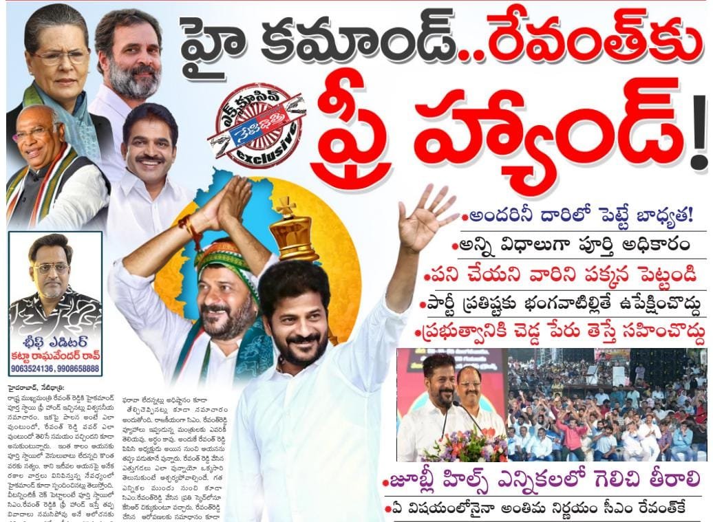 హైదరాబాద్, నేటిధాత్రి: రాష్ట్ర ముఖ్యమంత్రి రేవంత్ రెడ్డికి హైకమాండ్ పూర్త స్ధాయి ఫ్రీ హాండ్ ఇచ్చినట్లు విశ్వసనీయ సమాచారం. ఇకపై పాలన అంటే ఎలా వుంటుందో, రేవంత్ రెడ్డి పవర్ ఎలా వుంటుందో తెలిసే సమయం వచ్చిందని కూడా అనుకుంటున్నారు. ఇంత కాలం ఆయనకు పూర్తి స్దాయిలో వెసులుబాటు లేదన్నది కొంత వరకు సత్యం. కాని ఇటీవల ఆయనపై అనేక రకాల వార్తలు వినిపిస్తున్న నేపధ్యంలో హైకమాండ్ కూడా స్పందించినట్లు తెలుస్తోంది. వీటన్నింటికీ చెక్ పెట్టాలంటే పూర్తి స్దాయిలో సిఎం.రేవంత్ రెడ్డికి ఫ్రీ హాండ్ ఇస్తే తప్ప వివాదాలు సమసిపోవు అనే ఆలోచనకు వచ్చింది. అందుకే ఇటీవల జరిగిన మంత్రి వర్గ సమావేశంలో కూడా సిఎం. రేవంత్ రెడ్డి ఇకపై తన మార్కు పాలనను చూపిస్తానని కూడా స్పష్టం చేసినట్లు సమాచారం. ముఖ్యంగా ఓ దినపత్రికలో వచ్చిన వార్త ప్రకారం సిఎం. రేవంత్ రెడ్డి మంత్రుల్లో ఎవరు తనపై అసత్య ప్రచారాలు సాగేలా వ్యవహరిస్తున్నారన్న దానిపై చాల సేపు ప్రశ్నించినట్లు కూడా సమాచారం. ఎందుకంటే పార్టీ కోసం కష్టపడిరది రేవంత్ రెడ్డి. పార్టీని అదికారంలోకి తీసుకురావడంలో అందరికన్నా కీలకభూమిక పోషించింది రేవంత్ రెడ్డి. అధిష్టానం ఆషామాషీగా రేవంత్రెడ్డిని సిఎం. చేయలేదు. అదిష్టానానికి అన్నీ తెలుసు. రేవంత్ రెడ్డి రాజకీయ వ్యూహాలు తెలుసు. రేవంత్ రెడ్డి వేసిన ఎత్తుగడల్లో కేసిఆర్ ఎలా చిక్కుకున్నారో తెలుసు. అందుకే పార్టీ అధిష్టానం రేవంత్రెడ్డిని సిఎం. చేసింది. ఈ మాత్రం అవగాహన రాష్ట్రంలోని ప్రజలందరికీ తెలుసు. కాని కాంగ్రెస్ పార్టీ నాయకులందరికీ తెలుసు. అయినా తాము ముఖ్యమంత్రి కావాలన్న ఆకాంక్ష మేరకు కొ ంత మంది మంత్రులు పరోక్షంగా ప్రభుత్వాన్ని ఇబ్బందులకు గురి చేస్తున్నట్లు కూడా సిఎం. దృష్టికి వచ్చింది. పైగా వ్యక్తిగతంగా సిఎం. రేవంత్రెడ్డిని ఇరుకున పెట్టే ప్రయత్నాలు కూడా జరుగుతున్నాయన్నది గుర్తించారు. అందుకే మంత్రి వర్గ సమావేశంలో మంత్రులందిరి పనితీరుపై సుధీర్ఘంగా చర్చ జరిగింది. పైగా ఆయా మంత్రుల తీరుపై కూడా అదిష్టానానికి సమగ్రమైన నివేధిక కూడా సిఎం. రేవంత్ రెడ్డి ఇచ్చినట్లు వార్తలు వచ్చాయి. ప్రస్తుతం వున్న క్యాబినేట్లో చాలా మంది మంత్రులు సిఎం.కు ఇబ్బందికరమైన పరిస్ధితులు తెచ్చిపెట్టాలనే చూస్తున్నారు అనేది వెల్లడౌతోంది. పైగా తమ ఇష్టాను సారం కూడా కొంత మంది మంత్రులు పనిచేస్తున్నారు. అందుకే ఇలాంటి ఇబ్బ ందికరమైన పరిస్ధితులు ఎదురౌతున్నాయి. కాంగ్రెస్ పార్టీ అధికారంలోకి రావడం వల్లనే తాము పదువుల్లో వున్నామన్న విషయాన్ని చాలా మంది మంత్రులు మర్చిపోతున్నట్లున్నారు. తమ వల్లనే పార్టీ అధికారంలోకి వచ్చిందని కూడా కొంత మంది అనుకుంటున్నట్లు కూడా గుసగుసలు వినిపిస్తున్నాయి. వీర