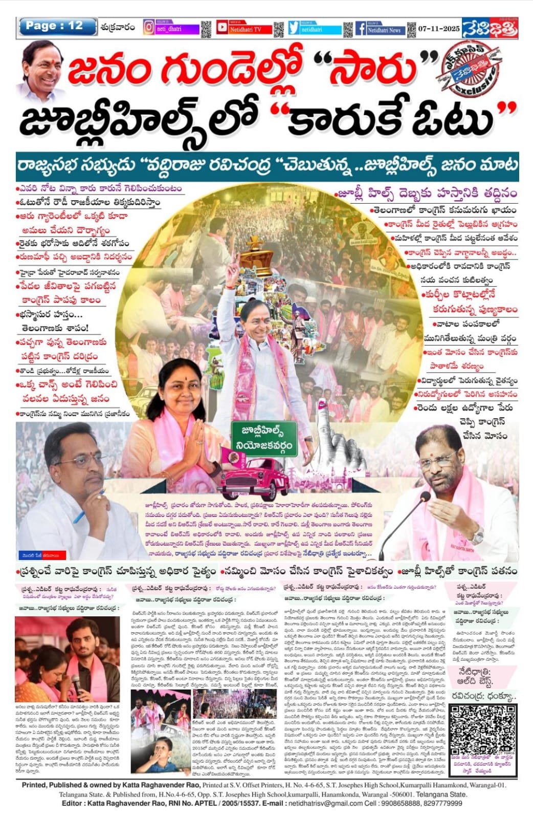 జవాబు..రాజ్యసభ సభ్యులు వద్దిరాజు రవిచంద్ర : ఇది వరకు నమ్మే తెలంగాణ ప్రజలు నిండా మునిపోయారు. రేవంత్ రెడ్డి మాటలు నమ్మి మోస పోయారు. ఆరు గ్యారెంటీలంటూ అబద్దాలు చెబితే నమ్మారు. ఇంకా నమ్మమంటే ఎలా నమ్ముతారు? ఎందుకు నమ్ముతారు? ఇది ప్రజాస్వామ్యం. పైగా ఈ రెండేళ్ల కాలంలో ఆయన ఒక్క నిజమైనా మాట్లాడారా? జనానికి పనికొచ్చే పని ఒక్కటైనా చేశారా? మచ్చుకు కూడా చెప్పుకోవడానికి ఒక్కటైనా వుందా? ఏ రంగమైనా ముందట పడిరదా? అన్ని ఫెయిల్యూర్లే. రుణమాఫీ చేస్తామన్నారు. చేశామని గొప్పలు చెప్పుకున్నారు. కాని రైతులేమంటున్నారో కాంగ్రెస్ నాయకులకు తెలియదా? కాంగ్రెస్ నాయకులకే రుణమాఫీ జరగలేదని చెప్పుకుంటున్నారు. రైతు భరోసా రూ.15వేలు ఇస్తామన్నారు. కనీసం గతంలో కేసిఆర్ ఇచ్చిందికూడా ఇవ్వడం లేదు. అది కూడా అందరికీ అందడం లేదు. ఇప్పటికే రెండు విడుతల బాకీ వున్నారు. మేమైనా దివానాగాళ్లమా? రైతు బంధు ఎందుకు ఆపేస్తామని సభల్లో రేవంత్ రెడ్డి అన్నారు. కేసిఆర్ ఇస్తున్న పది వేలకు బదులు రూ.15 వేలు ఎకరానికి ఇస్తామన్నారు. పాపం రైతన్నలు నమ్మారు. రేవంత్రెడ్డి ముందు నుంచి మోసం చేస్తానని చెబుతూనే వున్నారు. కాని ప్రజలు అమాయకులు నమ్మారు. కాని ఇంకా మోసం చేస్తామంటే, మోస పోవడానికి ప్రజలు సిద్దంగా లేరు. కౌలు రైతులకు కూడా ఏటా రూ.12000 ఇస్తామన్నారు. ఇలా ఎన్ని ఎన్ని అబద్దాలు ఆడారో తెలియంది కాదు. అందుకే ఆరు గ్యారెంటీలే కాదు, కాంగ్రెస్ ఇచ్చిన మొత్తం హమీలు 420. అంటేనే ఇక్కడే తేలిపోయింది. ఆ హమీలు అమలు కావన్నది అప్పుడే కాంగ్రెస్ చెప్పింది. కాని రాహుల్ గాందీ, ప్రియాంక గాందీ, సోనియా గాందీలను రప్పించి అబద్దాలు చెప్పించారు. జనాన్ని నమ్మించారు. ఒక్కసారి ఒక్క అవకాశం ప్లీజ్ ప్లీజ్ అంటూ రేవంత్ రెడ్డి బ్రతిమిలాడాడు. ఇప్పుడు ఓటెయ్యకపోతే పథకాలు అపేస్తామని బెదిరిస్తున్నాడు. అందుకే జూబ్లీహిల్స్ ప్రజలు కాంగ్రెస్ను తక్కు తుక్కుగా ఓడిరచేందుకు సిద్దపడుతున్నారు. పిక్సైయ్ వున్నారు.