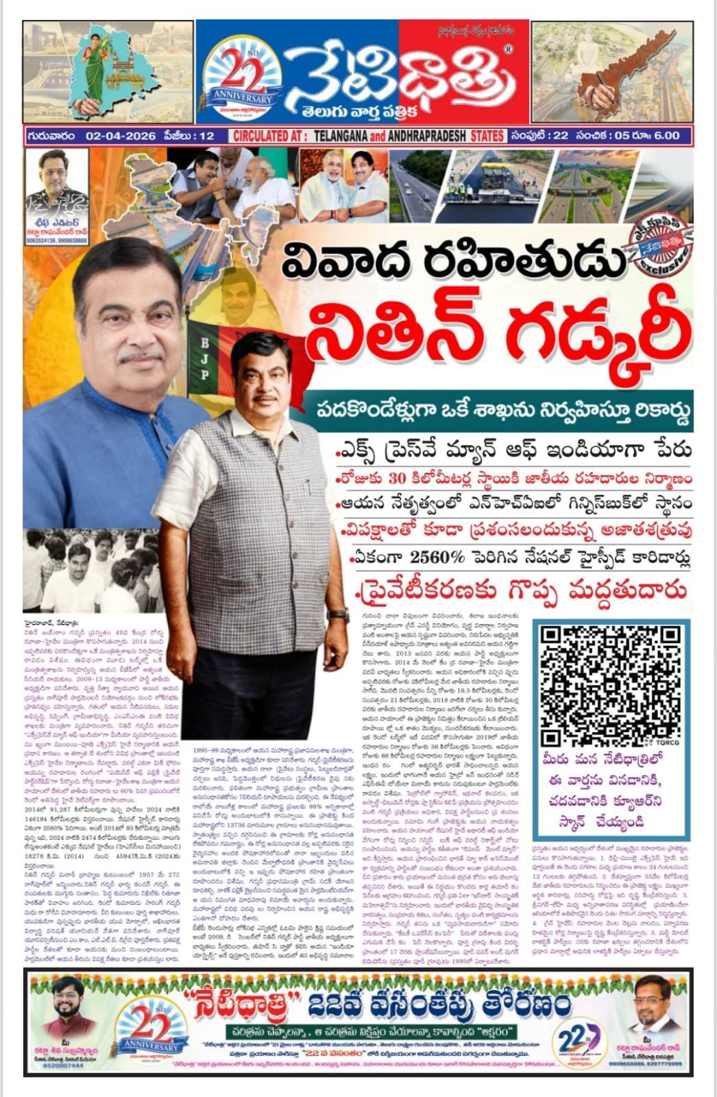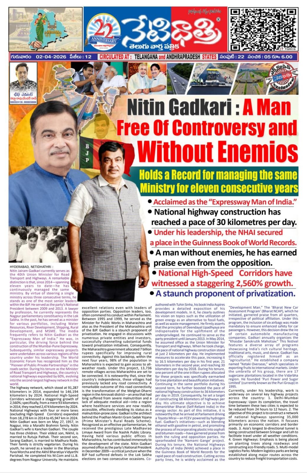 నితిన్ జయ్రాం గడ్కరీ ప్రస్తుతం 40వ కేంద్ర రోడ్డు రవాణా`హైవేల మంత్రిగా కొనసాగుతున్నారు. 2014 నుంచి ఇప్పటివరకు పదకొండేళ్లుగా ఒకే మంత్రిత్వశాఖను నిర్వహిస్తూ రావడం విశేషం. ఈవిధంగా మూడు టర్మ్ల్లో ఒకే మంత్రిత్వశాఖను నిర్వహిస్తున్న ఆయన బీజేపీలో అత్యంత సీనియర్ నాయకులు. 2009`13 మధ్యకాలంలో పార్టీ జాతీయ అధ్యక్షుడిగా పనిచేశారు. వత్తి రీత్యా న్యాయవాది అయిన ఆయన ప్రస్తుతం నాగ్పూర్ పార్లమెంటరీ నియోజకవర్గం నుంచి లోక్సభకు ప్రాతినిధ్యం వహిస్తున్నారు. గతంలో ఆయన నీటివనరులు, నదుల అభివద్ధి, షిప్పింగ్, గ్రామీణాభివద్ధి, ఎంఎసఎంఈ వంటి వివిధ శాఖలకు మంత్రిగా వ్యవహరించారు. నితిన్ గడ్కరీని తరచుగా “ఎక్స్ప్రెస్వే మ్యాన్ ఆఫ్ ఇండియా”గా మీడియా వ్యవహరిస్తుంటుంది. ము ఖ్యంగా ముంబయి`పూణె ఎక్స్ప్రెస్ హైవే నిర్మాణానికి ఆయనే ప్రధాన కారణం. ఆ తర్వాత దే శంలోని వివిధ ప్రాంతాల్లో ఇటువంటి ఎక్స్ప్రెస్ హైవేల నిర్మాణాలను చేపట్టారు. వరల్డ్ ఎకనా మిక్ ఫోరం ఆయన్ను రహదారుల రంగంలో “పయెనీర్ ఆఫ్ పబ్లిక్ ప్రైవేట్ పార్ట్నర్షిప”గా పేర్కొంది. రోడ్డు రవాణా`హైవేలశాఖ మంత్రిగా ఆయన హయాంలో దేశంలో జాతీయ రహదారు లు 60% పెరిగి ప్రపంచంలోనే రెండో అతిపెద్ద హైవే నెట్వర్క్గా రూపొందాయి.