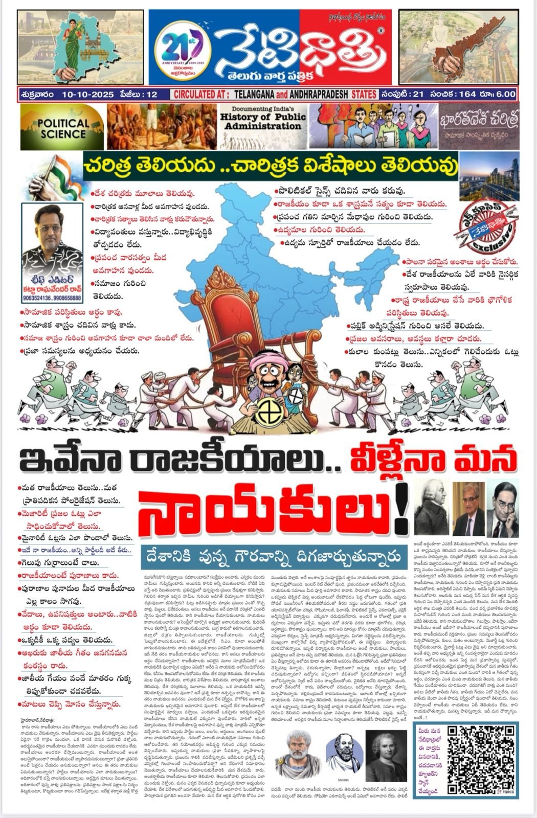 రాను రాను రాజకీయాలు ఎటు పోతున్నాయి. రాజకీయాలలోకి ఎటు వంటి నాయకులు చేరుతున్నారు. రాజకీయాలను ఎటు వైపు తీసుకెళ్తున్నారు. పార్టీలు ఏవైనా సరే గొర్రెల మందలా, ఒక దానికి వెనుక మరొకటి వెళ్తోంది. ఆదర్శవంతమైన రాజకీయాలు చేయడానికి ఎవరూ ముందుకు రావడం లేదు. రాజకీయాలు అందరూ చేస్తామంటున్నారు. రాజకీయాలంటే అంత అలుసైపోయిందా? రాజకీయమంటే వ్యాపారమనుకంటున్నారా? ప్రజా ప్రతినిది అంటే పెత్తనం చేయడం అనుకుంటున్నారా? అసలు ఈ తరం నాయకులు ఏమనుకుంటున్నారు? పార్టీలు రాజకీయాలను ఎలా వాడుకుంటున్నాయి? అధికారంలోకి వస్తే చాలనుకుంటున్నాయి. అడ్డమైన మాటలు చెబుతున్నాయి. అదికారంలో వున్న వాళ్లు ప్రతిపక్షాలను, ప్రతిపక్షాలు పాలక పక్షాలను నిత్యం తిట్టుకుంటూ, కొట్టుకుంటూ కాలం గడిపేస్తున్నాయి. ఐదేళ్ల తర్వాత మళ్లీ కొత్త ముసుగేసుకొని వస్తున్నాయి. పధకాలంటారు? సంక్షేమం అంటారు. ఎన్నికల ముందు హమీలు గుప్పిస్తుంటారు. అయినవి, కానివి అన్నీ చెబుతుంటారు. నోటికి ఏది వస్తే అది చెబుతుంటారు. ప్రతిపక్షంలో వున్నప్పుడు ప్రజలు దేవుళ్లుగా కనిపిస్తారు. గెలిచిన తర్వాత ఇచ్చిన హమీల గురించి అడిగితే దెయ్యాలుగా కనిపిస్తారు? శత్రువులుగా కనిపిస్తారు? ఓట్లు అడిగినప్పుడు మాత్రం ప్రజలు ఎంతో గొప్ప వాళ్లు. విజ్ఞులు. వివేకవంతులు. అసలు రాజకీయం అనే పదానికి చరిత్రలో ఎంతటి స్ధానం వుందో తెలియదు. కాని రాజకీయాలు చేయానుకుంటారు. నాయకులు కావాలనుకుంటారు? అసెంబ్లీలో కూర్చొని అద్యక్షా! అనాలనుకుంటారు. కుదిరితే కాలం కలిసొస్తే మంత్రి కావాలనుకుంటారు. బుగ్గ కారులో తిరగాలనుకుంటారు. జిల్లాలో చక్రం తిప్పాలనుకుంటారు. రాజకీయాలను గుప్పిట్లో పెట్టుకోవాలనుకుంటారు. ఈ ఐదేళ్లలోనే సిఎం. కూడా అయిపోతే బాగుండనుకుంటారు. తాను బతికున్నంత కాలం పదవిలో వుండాలనుకుంటారు. ఇదీ నేటి తరం రాజకీయనాయకుల ఆలోచనలు. కాని అసలు రాజకీయాలను అర్ధం చేసుకున్నామా? రాజకీయాలకు అసలైన మూల సూత్రమేమిటి? ఒక నాయకుడికి వుండాల్సిన లక్షణం ఏమిటి? అనేది ఏ నాయకుడు ఆలోచించుకోవడం లేదు. కనీసం తెలుసుకోవాలనుకోవడం లేదు. దేశ చరిత్ర తెలియదు. దేశ రాజకీయ ముఖ చిత్రం తెలియదు. చారిత్రక విశేషాలు తెలియదు. చారిత్రాత్మక అంశాలు తెలియవు. దేశ చరిత్రకున్న మూలాలు తెలియవు. ఒక నాయకుడికి ఇవన్నీ తెలియాల్సిన అవసరం వుందా? అనే ప్రశ్న కూడా ఉత్పన్నం కావొచ్చు. కాని ఈ తరం నాయకులు అవసరం. ఎందుకంటే మన దేశ విస్తీర్ణం, బౌగోళిక అంశాలపై నాయకులకు ఖచ్చితమైన అవగాహన వుండాలి. అప్పుడే దేశ రాజకీయాలలో సంపూర్ణమైన మార్పులు వస్తాయి. ఎందుకంటే ఒకప్పుడు ఆదర్శవంతమైన రాజకీయాలు చేసిన నాయకులే ఎక్కువగా వుండేవారు. వారిలో ఉన్నత విద్యావంతులు, దేశ రాజకీయాలపై అవగాహన వున్న వాళ్లు మాత్రమే ఎన్నిక