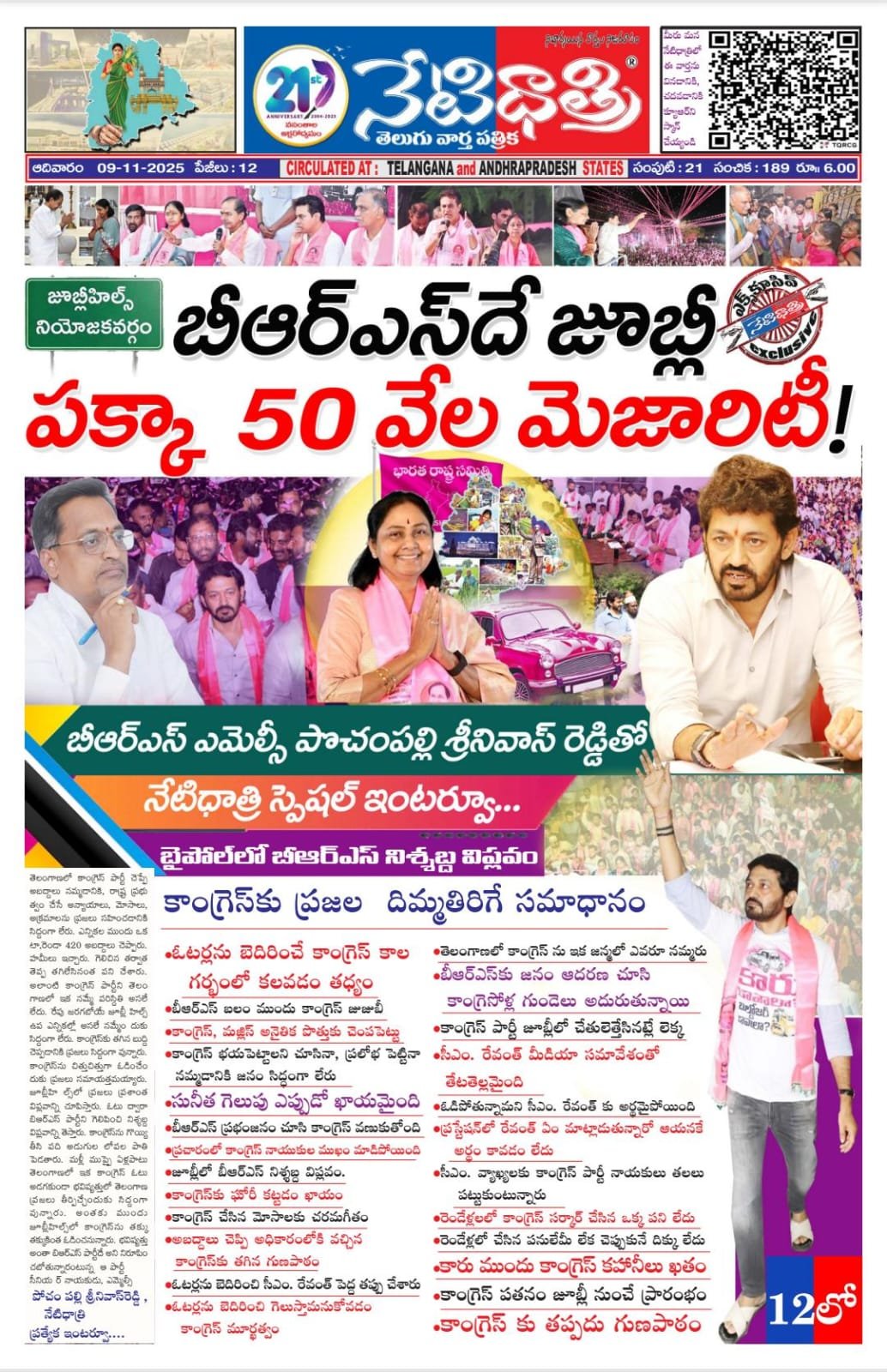 తెలంగాణలో కాంగ్రెస్ పార్టీ చెప్పే అబద్దాలు నమ్మడానికి, రాష్ట్ర ప్రభుత్వం చేసే అన్యాయాలు, మోసాలు, అక్రమాలను ప్రజలు సహించడానికి సిద్దంగా లేరు. ఎన్నికల ముందు ఒకటా, రెండా 420 అబద్దాలు చెప్పారు. హమీలు ఇచ్చారు. గెలిచిన తర్వాత తెప్ప తగిలేసినంత పని చేశారు. అలాంటి కాంగ్రెస్ పార్టీని తెలంగాణలో ఇక నమ్మే పరిస్దితి అసలే లేదు. రేపు జరగబోయే జూబ్లీహిల్స్ ఉప ఎన్నికల్లో అసలే నమ్మేందుకు సిద్దంగా లేరు. కాంగ్రెస్కు తగిన బుద్ది చెప్పడానికి ప్రజలు సిద్దంగా వున్నారు. కాంగ్రెస్ను చిత్తుచిత్తుగా ఓడిరచేందుకు ప్రజలు సమాయత్తమయ్యారు. జూబ్లీహిల్స్లో ప్రజలు ప్రశాంత విప్లవాన్ని చూపిస్తారు. ఓటు ద్వారా బిఆర్ఎస్ పార్టీని గెలిపించి నిశ్శబ్ద విప్లవాన్ని తెస్తారు. కాంగ్రెస్ను గొయ్యి తీసి పది అడుగుల లోపల పాతి పెడతారు. మళ్లీ ముప్పై ఏళ్లపాటు తెలంగాణలో ఇక కాంగ్రెస్ ఓటు అడగకుండా భవిష్యత్తులో తెలంగాణ ప్రజలు తీర్పిచ్చేందుకు సిద్దంగా వున్నారు. అంతకు ముందు జూబ్లీహిల్స్లో కాంగ్రెస్ను తక్కు తక్కుకింత ఓడిరచనున్నారు. భవిష్యత్తు అంతా బిఆర్ఎస్ పార్టీదే అని నిరూపించబోతున్నారంటున్న ఆ పార్టీ సీనియర్ నాయకుడు, ఎమ్మెల్సీ పోచం పల్లి శ్రీనివాస్రెడ్డి ,నేటిధాత్రి ప్రత్యేక ఇంటర్వూ….