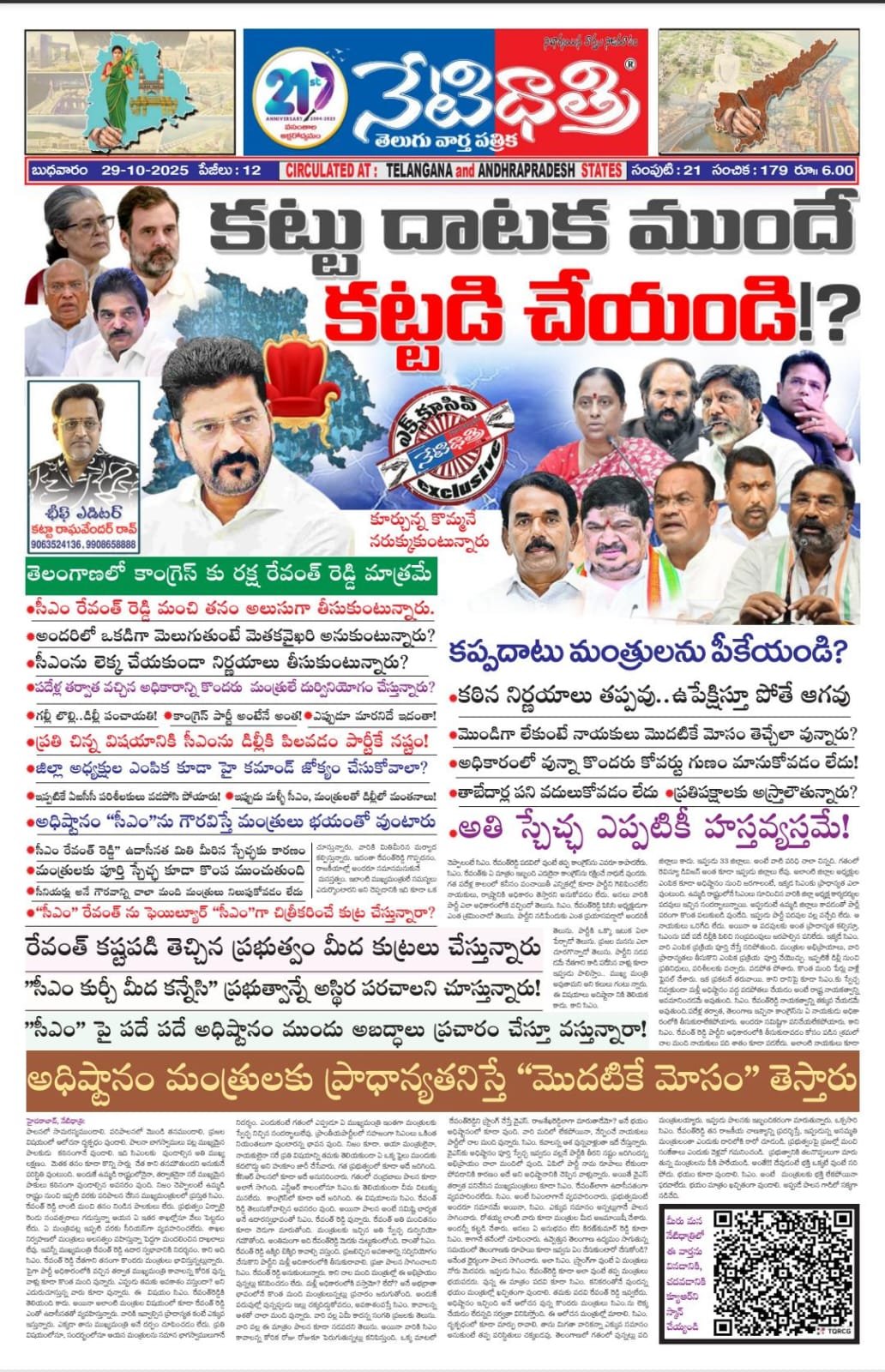 పాలనలో సామరస్యముండాలి. పరిపాలనలో మొండి తనముండాలి. ప్రజల విషయంలో ఆలోచనా దృక్పధం వుండాలి. పాలనా బాగస్వాములు పట్ల ముఖ్యమైన పాలకుడు కఠినంగానే వుండాలి. ఇది సిఎంలకు వుండాల్సిన అతి ముఖ్య లక్షణం. మెతక తనం కూడా కొన్ని సార్లు చేత కాని తనమౌతుందని అనుకునే పరిస్ధితి వుంటుంది. అందుకే ఉమ్మడి రాష్ట్రంలోనైనా, తర్వాతనైనా సరే ముఖ్యమైన పాకులు కఠినంగా వుండాల్సిన అవసరం వుంది. నిజం చెప్పాలంటే ఉమ్మడి రాష్ట్రం నుంచి ఇప్పటి వరకు పరిపాలన చేసిన ముఖ్యమంత్రులలో ప్రస్తుత సిఎం. రేవంత్ రెడ్డి లాంటి మంచి తనం నిండిన పాలకులు లేరు. ప్రభుత్వం ఏర్పాటై రెండు సంవత్సరాలు గడుస్తున్నా ఆయన ఏ ఇతర శాఖల్లోనూ వేలు పెట్టడం లేదు. ఏ మంత్రిపట్ల ఇప్పటి వరకు సీరియస్గా వ్యవహరించలేదు. శాఖల నిర్వహణలో మంత్రులు అలసత్వం వహిస్తున్నా పెద్దగా మందలించిన దాఖలాలు లేవు. ఇవన్నీ ముఖ్యమంత్రి రేవంత్ రెడ్డి ఉదార స్వభావానికి నిదర్శనం. కాని అది సిఎం. రేవంత్ రెడ్డి చేతగాని తనంగా కొందరు మంత్రులు భావిస్తున్నట్లున్నారు. పైగా పార్టీ అధికారంలోకి వచ్చిన తర్వాత ముఖ్యమంత్రి కావాలన్న కోరిక వున్న వాళ్లు కూడా కొంత మంది వున్నారు. ఎప్పుడు తమకు అవకాశం వస్తుందా? అని ఎదురుచూస్తున్న వారు కూడా వున్నారు. ఈ విషయం సిఎం. రేవంత్రెడ్డికి తెలియంది కాదు. అయినా అలాంటి మంత్రుల విషయంలో కూడా రేవంత్ రెడ్డి ఎంతో ఉదాసీనతతో వ్యవహిస్తున్నారు. వారికి ఇవ్వాల్సిన ప్రాదాన్యత కంటే ఎక్కువ ఇస్తున్నారు. ఎక్కడా తాను ముఖ్యమంత్రి అనే దర్పం చూపించడం లేదు. ప్రతి విషయంలోనూ, సందర్భంలోనూ ఆయన మంత్రులను సమాన భాగస్వాములుగానే చూస్తున్నారు. వారికి మితిమీరిన మర్యాద కల్పిస్తున్నారు. ఇదంతా రేవంత్రెడ్డి గొప్పదనం. రాజకీయాల్లో అందరూ సమానమనుకునే మనస్తత్వం. ఇలాంటి ముఖ్యమంత్రులే సమస్యలు ఎదుర్కొంటారని అని చెప్పడానికి ఇది కూడా ఒక నిదర్శం. ఎందుకంటే గతంలో ఎప్పుడూ ఏ ముఖ్యమంత్రి ఇంతగా మంత్రులకు స్వేచ్ఛ నిచ్చిన సందర్భాలులేవు. ప్రాంతీయపార్టీలలో సహజంగా సిఎంలు ఒకింత నియంతలుగా వుంటారన్న భావన వుంది. నిజం కూడా. ఆయా మంత్రులైనా, నాయకులైనా సరే ప్రతి విషయాన్ని తమకు తెలియకుండా ఏ ఒక్క ఫైలు ముందుకు కదలొద్దు అని హుకూం జారీ చేసేవారు. గత ప్రభుత్వంలో కూడా అదే జరిగింది. కేసిఆర్ పాలనలో కూడా అదే అనుసరించారు. గతంలో చంద్రబాబు పాలన కూడా అలాగే సాగింది. ఎన్టీఆర్ కాలంలోనూ సిఎం.కు తెలియకుండా చీమ చిటుక్కుమనలేదు. కాంగ్రెస్లో కూడా అదే జరిగింది. ఈ విషయాలను సిఎం. రేవంత్ రెడ్డి తెలుసుకోవాల్సిన అవసరం వుంది. అయినా పాలన అంటే సమిష్టి బాద్యత అనే ఉదారస్వభావంతో సిఎం. రేవంత్ రెడ్డి వున్నారు. రేవంత్ అతి మంచితనం కూడా చెడుగా మారుతోంది. మంత్రులకు ఇచ్చిన అతి స్వేచ్చ దుర
