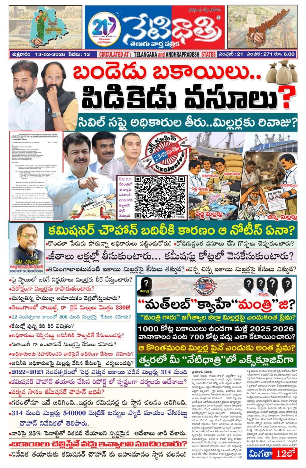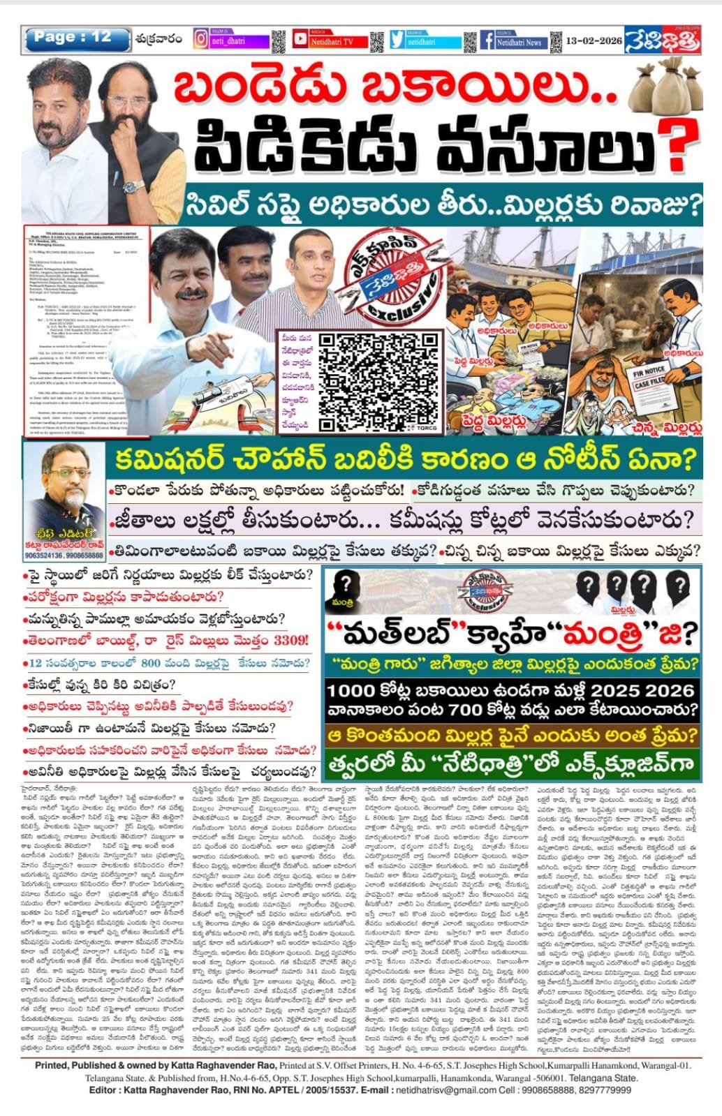 సివిల్ సప్లయ్ శాఖను గాడిలో పెట్టలేరా? పెట్టే అవకాశంలేదా? ఆ శాఖను గాడిలో పెట్టడం పాలకుల వల్ల కావడం లేదా? గత పదేళ్లు అంతే, ఇప్ప్పుడూ అంతేనా? సివిల్ సప్లై శాఖ ఏమైనా తేనె తుట్టెనా? కదిలిస్తే, పాలకులకు ఏమైనా ఇబ్బందా? రైస్ మిల్లర్లు, అదికారుల కలిసి ఆడుతున్న నాటకాలు పాలకులకు తెలియదా? ముఖ్యంగా ఆ శాఖ మంత్రులకు తెలియదా? సివిల్ సప్లై శాఖ అంటే అంత ఉదాసీనత ఎందుకు? రైతులను మోస్తున్నారు? ఇటు ప్రభుత్వాన్ని మోసం చేస్తున్నారు? అయినా పాలకులకు కనిపించడం లేదా? జరుగుతున్న వ్యవహారం చూస్తూ వదిలేస్తున్నారా? ఇబ్బడి ముబ్బడిగా పెరుగుతున్న uకాయిలు కనిపించడం లేదా? కొండలా పెరుగుతున్నా వసూలు చేయడం ఇష్టం లేదా? ప్రభుత్వానికి జోక్యం చేసుకునే సమయం లేదా? అదికారులు పాలకులను తప్ప్పుదారి పట్టిస్తున్నారా? ఇంతకూ ఏం సివిల్ సప్లైశాఖలో ఏం జరుగుతోంది? ఆరా తీసేవారే లేరా? ఆ శాఖ మీద దష్టిపెట్టిన కమీషనర్లకు ఎందుకు స్ధాన చలనాలు జరగుతున్నాయి. అసలు ఆ శాఖలో వున్న లోతులు తెలుసుకునే లోపే కమీషనర్లను ఎందుకు మార్చుతున్నారు. తాజాగా కమీషనర్ చౌహన్ను కూడా ఇదే పరిస్దితుల్లో మార్చారా? ఒకప్ప్పుడు సివిల్ సప్లై శాఖ అంటే ఉద్యోగులకు అంత క్రేజ్ లేదు. పాలకులు అంత దష్టిపెట్టాల్సిన పని లేదు. కాని ఇప్ప్పుడు రెవిన్యూ శాఖను మంచి పోయిన సివిల్ సప్లై గురించి పాలకులు కావాలనే పట్టించుకోవడం లేదా? గతంలో లాగానే అందులో ఏమీ లేదనుకుంటున్నారా? సివిల్ సప్లై మీద లోతుగా అద్యయనం చేయాలన్న ఆలోచన కూడా పాలకులులేదా? ఎందుకంటే గత పదేళ్ల కాలం నుంచి సివిల్ సప్లైశాఖలో బకాయిలు కొండలా పేరుతుకుపోతున్నాయి. సుమారు 25 వేల కోట్ల రూపాయల వరకు బకాయిలున్నట్లు తెలుస్తోంది. ఆ బకాయిలు వసూలు చేస్తే రాష్ట్రంలో అనేక సంక్షేమ పథకాలు అమలు చేయడానికి వీలౌతుంది. రాష్ట్ర ప్రభుత్వం మిగులు బడ్జెట్లోకి వెళ్తుంది. అయినా పాలకులు ఆ దిశగా దష్టిపెట్టడం లేదు? కారణం తెలియడం లేదు? తెలంగాణ వాప్తంగా సుమారు 3వేలకు పైగా రైస్ మిల్లులున్నాయి. అందులో మెజార్టీ రైస్ మిల్లులు పారాబాయిల్డ్ మిల్లులున్నాయి. కొన్ని దశాబ్దాలుగా పాతుకపోయిన ఆ మిల్లర్లదే హవా. తెలంగాణలో సాగు విస్తీర్ణం గణనీయంగా పెరిగిన తర్వాత పంటలు విపరీతంగా దిగుబడులు రావడంలో అనేక మిల్లుల ఏర్పాటు జరిగింది. సంవత్సం మొత్తం పని వుండేంత వరి పండుతోంది. అలా అటు ఫ్రభుత్వానికి ఎంతో ఆదాయం సమకూరుతుంది. కాని అది ఖజానాకు చేరడం లేదు. కేవలం మిల్లర్లు, అధికారుల జేబుల్లోకి చేరుతోంది. ఇదంతా బహిరంగ రహస్యమే? అయినా ఎటు వంటి చర్యలు వుండవు. అసలు ఆ దిశగా పాలకుల ఆలోచనలే వుండవు. పంటలు మార్కెట్కు రాగానే ప్రభుత్వం రైతులకు సొమ్ము చెల్లిస్తుంది. అక్కడ ఎలాంటి జాప్యం జరగదు. వడ్లు తీసుకునే మిల్లర్లు అందుకు స
