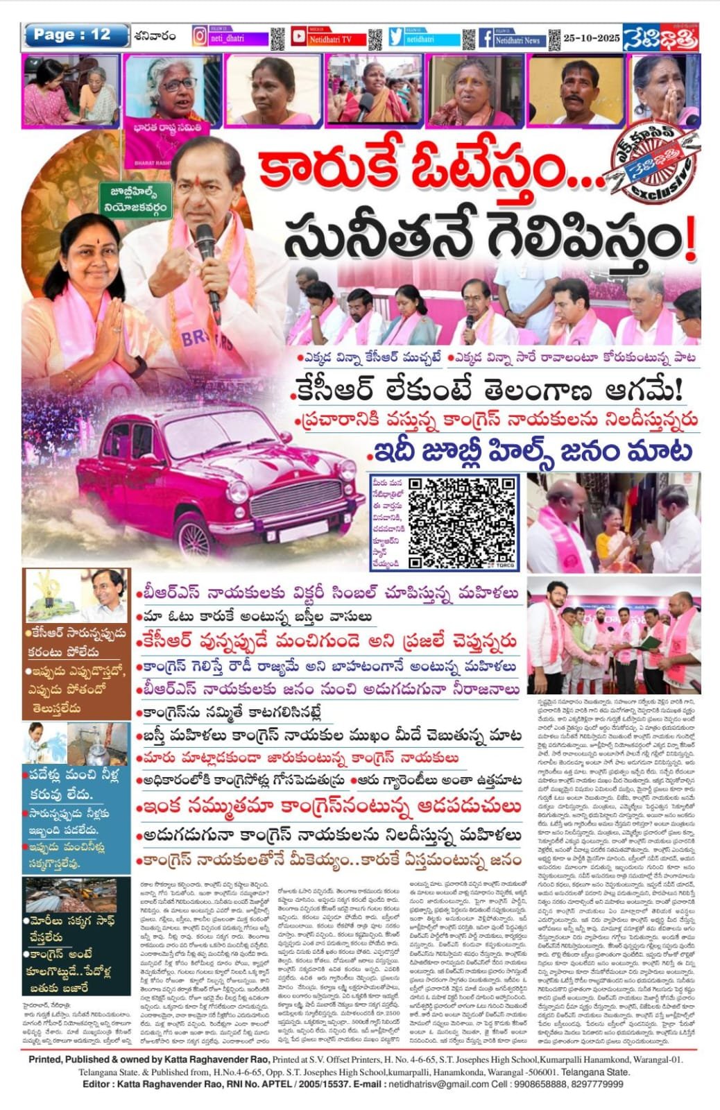 కారు గుర్తుకే ఓటేస్తాం. సునీతనే గెలిపించుకుంటాం. మాగంటి గోపీనాధ్ నియోజకవర్గాన్ని అన్ని రకాలుగా అభివృద్ది చేశారు. మాజీ ముఖ్యమంత్రి కేసిఆర్ మమ్మల్ని అన్ని రకాలుగా ఆదుకున్నారు. బస్తీలలో అన్ని రకాల సౌకర్యాలు కల్పించారు. కాంగ్రెస్ వచ్చి కష్టాలు తెచ్చింది. జనాన్ని గోస పెడుతోంది. ఇంకా కాంగ్రెస్ను నమ్ముతామా? బరాబర్ సునీతనే గెలిపించుకుంటం..సునీతను బంపర్ మెజార్టీతో గెలిపిస్తం. ఈ మాటలు అంటున్నది ఎవరో కాదు. జూబ్లీహిల్స్ ప్రజలు. గల్లీలు, బస్తీలు, కాలనీల ప్రజలంతా ముక్త కంఠంతో చెబుతున్న మాటలు. కాంగ్రెస్ విచ్చనంక పడుతున్న గోసలు అన్నీ ఇన్నీ కావు. నీళ్లు రావు. కరంటు సక్కగ రాదు. తెలంగాణ రాకముందు వారం పది రోజులకు ఒకసారి మంచినీళ్లు వచ్చేటివి. ఎండాకాలమొస్తే బోరు నీళ్లు తప్ప మంచినీళ్లు గతి వుండేవి కాదు. మున్సిపల్ నీళ్ల కోసం కిలోమీటర్ల దూరం పోయి, క్యాన్లలో తెచ్చుకునేటోల్లం. గంటలు గంటలు క్యూలో నిలబడి ఒక్క క్యాన్ నీళ్ల కోసం రోజంతా క్యూలో నిల్చున్న రోజులున్నయి. కాని తెలంగాణ వచ్చిన తర్వాత కేసిఆర్ రోజూ నీళ్లిచ్చిండు. ఇంటింటికి నల్లా కనెక్షన్ ఇచ్చిండు. రోజూ ఇరవై వేల లీటర్ల నీళ్లు ఉచితంగా ఇచ్చిండు. ఒక్కనాడు కూడా నీళ్ల గోసలేకుండా చూసుకున్నడు. ఎండాకాలమైనా, వానా కాలమైనా సరే నీళ్లకోసం ఎదురుచూసింది లేదు. మళ్ల కాంగ్రెస్ వచ్చింది. రెండేళ్లుగా ఎండా కాలంలో పడుతున్న గోస అంతా ఇంతా కాదు. మున్సిపల్ నీళ్లు మూడు రోజులకోసారి కూడా సక్కగ వస్తలేవు. ఎండాకాలంలో వారం రోజులకు ఓసారి వచ్చినయ్. తెలంగాణ రాకముందు కరంటు కష్టాలు చూసినం. అప్పుడు సక్కగ కరంటే వుండేది కాదు. తెలంగాణ వచ్చినంక కేసిఆర్ ఇరవై నాలుగు గంటల కరంటు ఇచ్చిండు. కరంటు ఎప్పుడూ పోయేది కాదు. బస్తీలలో దోమలుంటాయి. కరంటు లేకపోతే రాత్రి పూట నరకం చూస్తాం. కాంగ్రెస్ వచ్చింది.. కరంటు కష్టమొచ్చింది. కేసిఆర్ వున్నప్పుడు ఎంత వాన పడుతున్నా కరంటు పోయేది కాదు. ఇప్పుడు చినుకు పడితే ఖతం కరంటు పోతది. ఎప్పుడొస్తదో తెల్వది. కరంటు కోతలు. దోమలుతో జరాలు వస్తున్నయి. కాంగ్రెస్ సక్కదనానికి ఉచిత కంరటు అన్నది. ఎవలికి వస్తలేదు. ఉచిత ఆరు గ్యారెంటీలు చెప్పిండ్రు. ప్రజలను మోసం చేసింన్రు. కల్యాణ లక్ష్మి లక్షరూపాయలతోపాటు, తులం బంగారం ఇస్తామన్నారు. ఏది ఒక్కలికి కూడా ఇయ్యలే. కళ్యాణ లక్ష్మి, షాదీ ముబారక్ చెక్కులు కూడా సక్కగ వస్తలేవు. ఆడపిల్లలకు స్కూటీలిస్తన్నరు. మహిళలందరికీ రూ.2500 ఇస్తమన్నరు. ఒక్కలికన్నా ఇచ్చిండ్రా.. 500లకే గ్యాస్ సిలిండర్ అన్నరు. ఇచ్చింది లేదు. సచ్చింది లేదు. ఇదీ జూబ్లీహిల్స్లో వున్న పేద ప్రజలు కాంగ్రెస్ నాయకులు ముఖం పట్టుకొని అంటున్న మాట. ప్రచారానికి వచ్చిన కాంగ్రెస్ నాయకులతో ఈ మాటలు అంటుంటే వాళ్లు సమాధానం చ