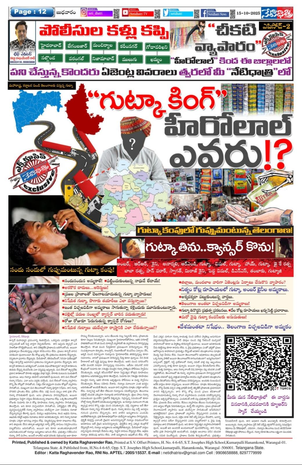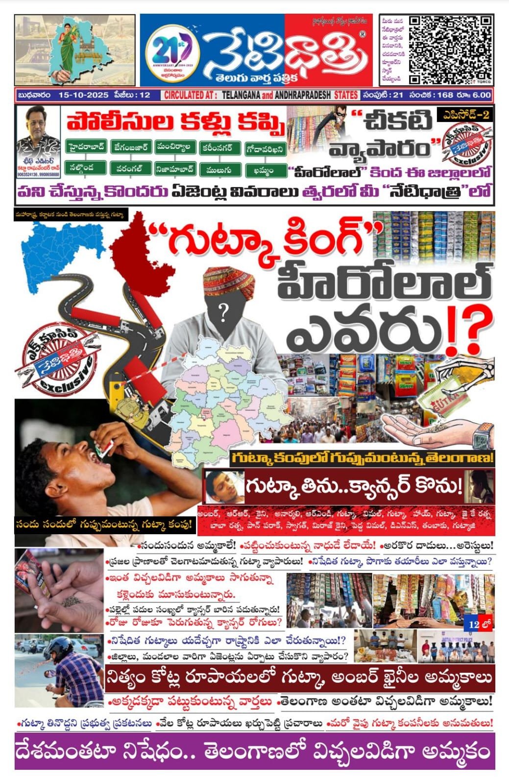 కాన్సర్ మహమ్మారి ప్రపంచాన్ని కబలిస్తోంది. ఒకప్పుడు ఎవరికైనా కాన్సర్ వచ్చిందంటే అదే పెద్ద వార్తగా చెప్పుకునేవారు. కాని ఇప్పుడు క్యాన్సర్ ఒక సాదాసీతా రోగమైపోయింది. కాని చికిత్సలేక ప్రాణాలను బలిగొంటోంది. అయినా ప్రభుత్వాలు మేలుకున్నట్లు ఎక్కడా కనిపించడం లేదు. ప్రజలు కాన్సర్ బారిన పడకుండా వుండాలంటూ వేల కోట్లు ఖర్చు చేసి ప్రకటనలు తయారు చేస్తున్నారు. విసృతంగా ప్రచారం చేస్తున్నారు. మీడియాలో, టెలివిజన్లలో, సినిమా ధియేటర్లలో నిత్యం కాన్సర్పై అవగాహన ప్రకటనలు విసృతంగా ప్రచారం చేస్తున్నారు. కాని కాన్సర్ కారకాలను అరికట్టడంలో ఎందుకు విఫలమౌతున్నారు? కాన్సర్ కారకాలను తయరు చేస్తున్న కంపనీలకు ఎలా పర్మిషన్లు ఇస్తున్నారు. మన దేశంలో క్యాన్సర్కు ప్రదాన కారకాలలో పొగాకు ఉత్పత్తుల పాత్ర పెద్దది. పొగాకు పంటలను పండుతూనే వుంటాయి. అటు గుట్కాల తయారీ జరుగుతూనే వుంటుంది. కాని మన దేశంలో గుట్కా నిషేదం. ఎలా జనం వద్దకు వస్తోంది. మన దేశంలో గుట్కా వ్యాపారం కొన్ని వేల కోట్లలో సాగుతోంది. నిత్యం దేశ వ్యాప్తంగా వందల కోట్లలో వ్యాపారం సాగుతోంది. ముఖ్యంగా మన తెలంగాణలో గుట్కా పూర్తిగా నిషేదం. కాని గుట్కా దొరకని ప్రాంతం లేదు. ప్రదేశం లేదు. పల్లె నుంచి పట్నం దాక ప్రతి చోట గుట్కా దొరుకుతూనే వుంది. జనం ప్రాణాలను హరిస్తూనేవుంది. అయినా ప్రభుత్వాలు పెద్దగా చర్యలు తీసుకుంటున్న దాఖలాలు లేవు. ఒక్క తెలంగాణలోనే రోజుకు సుమారు రూ.5 కోట్ల రూపాయల గుట్కా వ్యాపారం సాగుతున్నట్లు తెలుస్తోంది. అది కూడా విచ్చలవిడిగా సాగుతోంది. పటిష్టమైన చెక్ పోస్టు వ్యవస్ధలున్నప్పటికీ గుట్కా వ్యాపారులు యదేఛ్చగా ఎలా సరుకును రవాణా చేస్తున్నారన్నది తేలాల్సి వుంది. బియ్యం అక్రమరవాణ, కలప అక్రమ రవాణ, ఆఖరుకు లిక్కర్ అక్రమ రవాణాలు కూడా అరికడుతున్నారు. కాని గుట్కా రవాణా మాత్రం ఎక్కడా ఆగినట్లు వార్తలు లేవు. పట్టుకున్నట్లు కూడా దాఖలాలు లేవు. కాని జిల్లాలకు చేరిన తర్వాత అక్కడక్కడ టాస్స్ ఫోర్స్ దాడులు నిర్వహించడం పట్టుకోవడం జరుగుతోంది. అయినా అది కూడా అంతంతమాత్రంగానే జరుగుతుండడంతో గుట్కాల అమ్మకాలు ఆగింది లేదు. ప్రభుత్వం నిశేదించిన గుట్కా, పాన్ మసాల, అంబర్ లాంటివి అధిక ధరలకు విక్రయిస్తూ అలా కూడా సొమ్ము చేసుకుంటున్నారు. జనం జేబులకు చిల్లు పెట్టడమే కాదు, ప్రాణాలకు కూడా చిల్లులు పెడుతున్నారు. ముఖ్యంగా హైదరాబాద్తోపాటు, ఇతర నగరాల్లో పాతుకుపోయిన కొంత మంది మార్వాడీ వ్యాపారులే ఈ వ్యాపారాలను సాగిస్తున్నట్లు తెలుస్తోంది. కొంత మంది పేర్లుకూడా ప్రముఖంగా వినిపిస్తున్నాయి. కొద్ది సంవత్సరాలుగా కర్నాకట, రాజస్ధాన్, గుజరాత్లలో కంపనీలు ఏర్పాటు చేసి, అక్కడి నుంచి రహస్యంగా గుట్కాలను హైదరాబా
